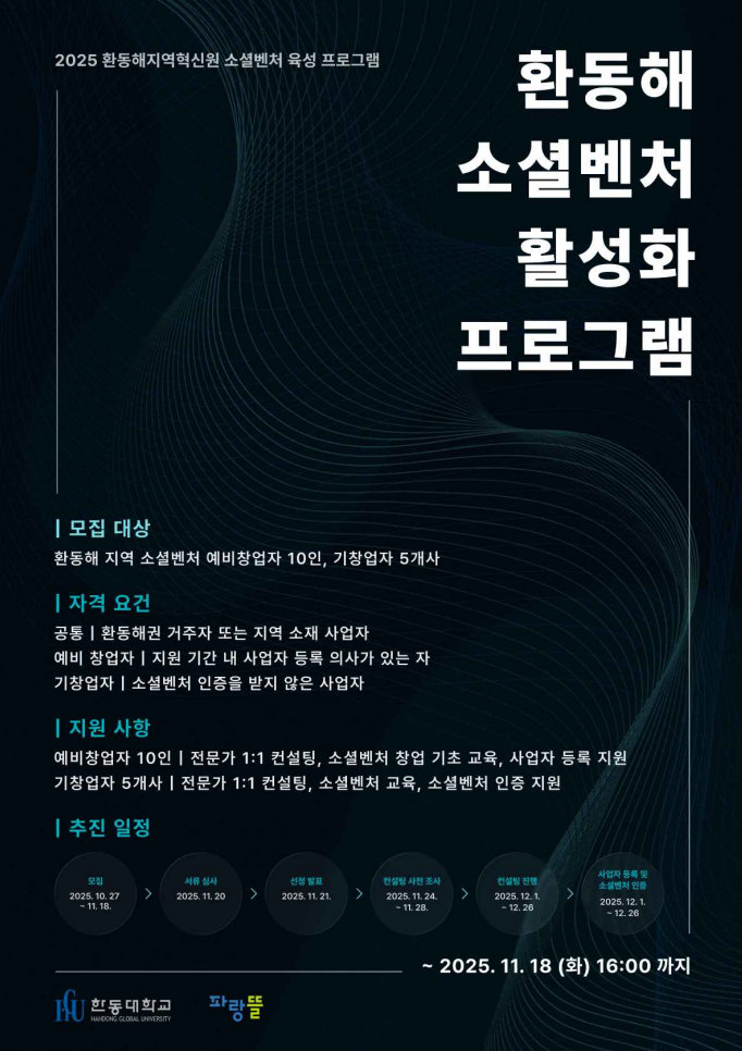한동대학교(총장 최도성) 환동해지역혁신원(원장 최인욱 콘텐츠융합디자인학부교수)은 11월 18일까지 환동해권 소셜벤처 예비창업자와 기창업자를 대상으로‘환동해소셜벤처 활성화 프로그램’지원자를 모집한다.